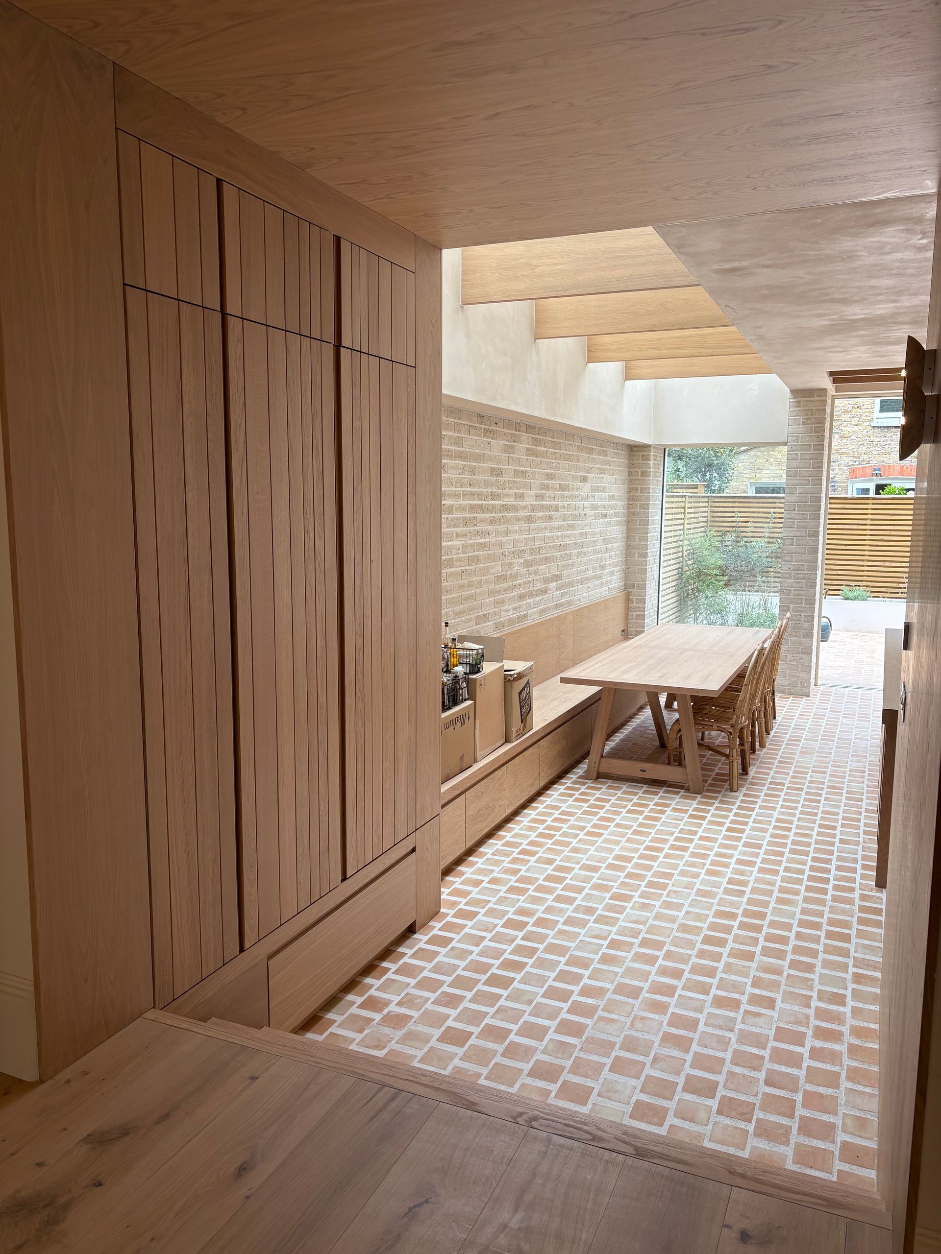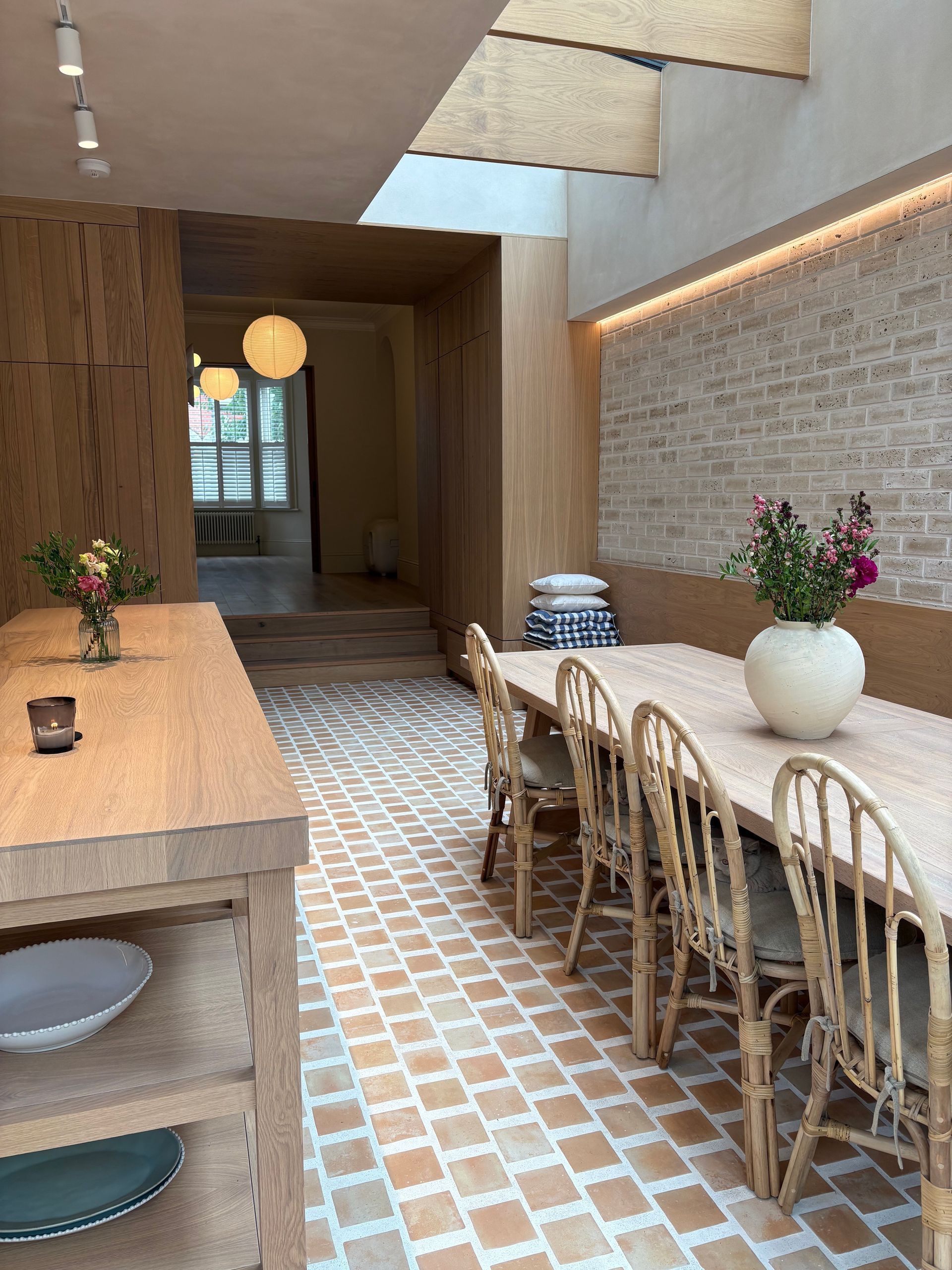 Archi.tile suministró 60 m² de nuestro pavimento de porcelana con efecto terracota para esta preciosa vivienda londinense. Nuestras baldosas de porcelana Terra Picolo Sand de 110x110 para este proyecto se han utilizado en todo el suelo de la cocina y en la zona del patio para ofrecer una versión continua de pavimento de terracota apta para uso interior y exterior. El diseño captura la calidez atemporal de la terracota, ofreciendo a la vez todas las ventajas prácticas de la porcelana. A diferencia de la terracota tradicional, estas baldosas no requieren limpieza especializada ni mantenimiento constante, lo que las convierte en una opción práctica para el día a día. Gracias a sus propiedades antideslizantes y resistentes a las heladas, este mismo material se integra a la perfección tanto en interiores como en exteriores, creando una transición fluida y armoniosa. Esto convierte a Terra Picolo Sand en la solución ideal para hacer realidad el diseño de tus sueños, sin los inconvenientes de la terracota natural.
